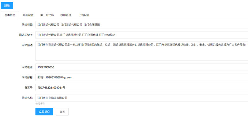 7.1 點(diǎn)擊 “系統(tǒng)設(shè)置” 里的 基本設(shè)置,可對(duì)網(wǎng)站標(biāo)題,網(wǎng)站關(guān)鍵詞,網(wǎng)站描述等進(jìn)行添加修改,添加網(wǎng)站標(biāo)題、網(wǎng)站關(guān)鍵詞、網(wǎng)站描述有利于網(wǎng)站優(yōu)化、收錄;點(diǎn)擊“新增”可增加新的設(shè)置,比如:增加QQ等(如下圖)