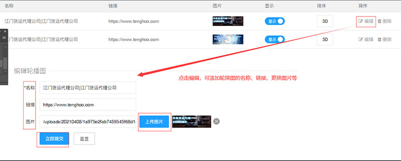 點(diǎn)擊“首頁(yè)輪換圖”可添加新的輪換圖。點(diǎn)擊右側(cè)“編輯”可添加輪換圖的名稱、鏈接、更換圖片等。點(diǎn)擊“首頁(yè)輪換圖”里面的新增可增加輪換圖數(shù)量。手機(jī)輪換圖同上。(ps.如果更換輪播圖,請(qǐng)前臺(tái)鼠標(biāo)右鍵圖片另存為 下載,這樣可以保證新替換的圖片和原有的圖片尺寸一致,或則按建議尺寸制作圖片)(如下圖)